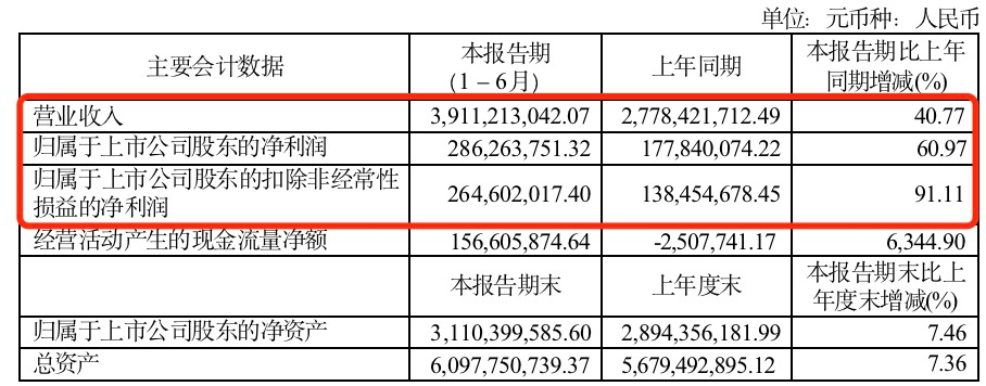 2022年上半年,公司实现营业收入39.11亿元,较上年同期增长40.77%;净利润2.86亿元,同比增长60.97%;扣非净利润2.65亿元,同比增长91.11%。