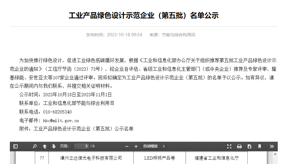 近日,国家级工业产品绿色设计示范企业(第五批)名单公布,漳州立达信光电子科技有限公司入围其中。据悉,本份名单经企业自评估、省级工业和信息化主管部门(或中央企业)推荐及专家评审后公示。