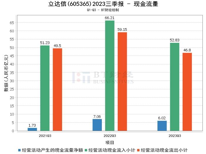 在现金流量方面,立达信2023年前三季度经营活动产生的现金流量净额为6.02亿元,相比上年同期的7.06亿元减少了14.65%。经营活动现金流入小计为52.83亿元,相比上年同期的66.21亿元减少了20.13%。经营活动现金流出小计为46.8亿元,相比上年同期的59.15亿元减少了20.79%。