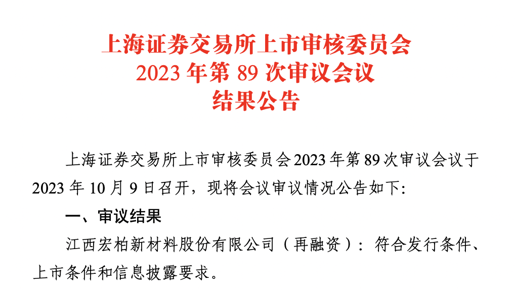 10月9日,据上交所,江西宏柏新材料股份有限公司(以下简称“宏柏新材”)再融资符合发行条件、上市条件和信息披露要求。
