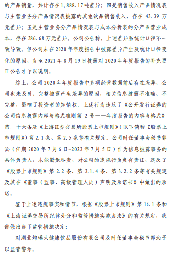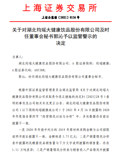 监管警示文件显示,根据证监会湖北监管局《关于对湖北均瑶大健康饮品股份有限公司采取责令改正措施的决定》([2021]28号)查明的事实及公司相关补充更正公告,均瑶健康于2021年4月16日披露的2020年年度报告第四节“经营情况讨论与分析”中,多处数据存在前后披露不一致。