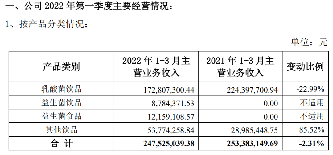 均瑶健康主营业务是含乳饮料中常温乳酸菌饮品的研发、生产和销售,主打产品为“味动力”乳酸菌饮品。但近年来,其主营业务表现却不尽如人意:2020年和2021年均瑶健康乳酸菌饮料业务营收分别下滑35%和2.09%。从最新一季度来看,均瑶健康乳酸菌饮品营收为1.73亿元,同比下滑22.99%。