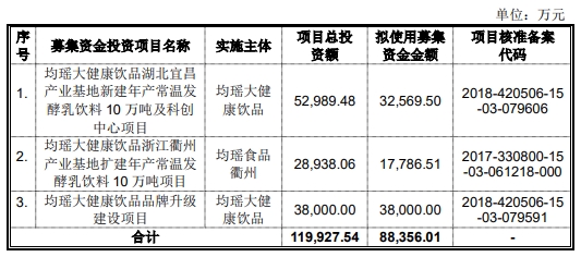 均瑶健康发行新股募集资金总额为9.40亿元,扣除发行费用后,募集资金净额为8.84亿元。均瑶健康于2020年8月5日披露的招股说明书显示,公司拟募集资金8.84亿元,分别用于均瑶大健康饮品湖北宜昌产业基地新建年产常温发酵乳饮料10万吨及科创中心项目、均瑶大健康饮品浙江衢州产业基地扩建年产常温发酵乳饮料10万吨项目、均瑶大健康饮品品牌升级建设项目。