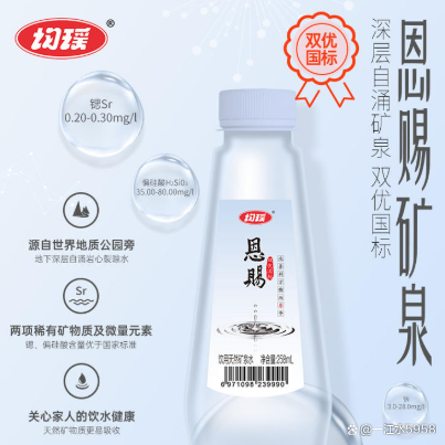 均瑶恩赐天然软矿泉水,源自大别山世界地质公园地下深层,经玄武岩等地壳岩层循环,层层涵养净化、渗流,形成富含偏硅酸和锶等微量元素和天然矿物质的复合型双优国标天然矿泉水。均瑶恩赐天然软矿泉水中的偏硅酸含量高达76.8mg/L,它能有效地维持人体的电解质平衡和生理机能,具有恢复血管弹性、增加皮肤弹性、促进骨骼发育等作用。