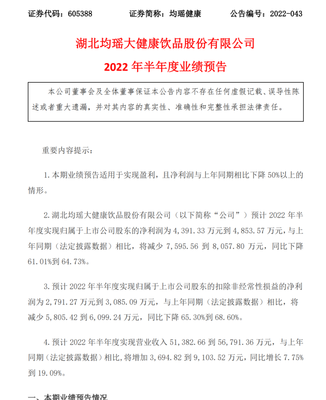 虽然收入实现了增长,但2022年半年度,均瑶健康实现归属于上市公司股东的净利润为 4391.33 万元到 4853.57 万元,与上年同期(法定披露数据)相比,将减少 7595.56 到 8057.80 万元,同比下降61.01%到 64.73%。