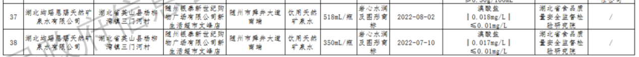 抽检不合格产品情况显示,随州银泰新世纪购物广场有限公司新生活超市文峰店销售的标称湖北均瑶恩赐天然矿泉水有限公司生产的饮用天然矿泉水(518mL/瓶)、饮用天然矿泉水(350mL/瓶),均为溴酸盐不符合食品安全国家标准规定,溴酸盐标准值为≤0.01mg/L,2批次产品的检测结果分别为0.018mg/L与0.017mg/L。检验机构为湖北省食品质量安全监督检验研究院。