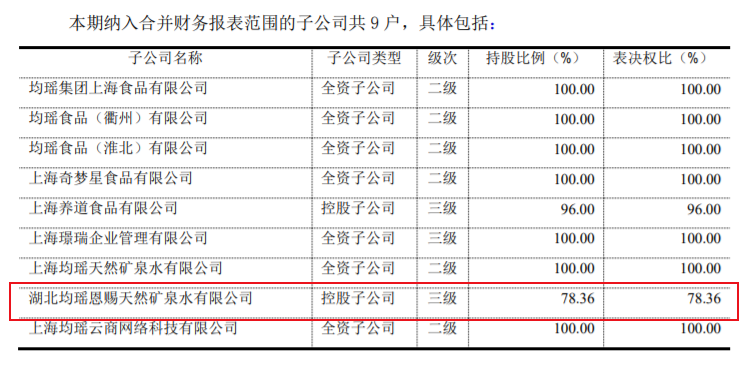 湖北均瑶大健康饮品股份有限公司(简称“均瑶健康”,605388.SH)年报显示,湖北均瑶恩赐天然矿泉水有限公司为均瑶健康持股78.36%的三级控股子公司。