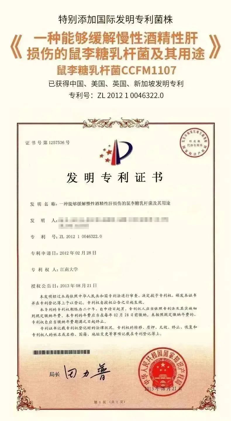 一款均瑶健康产品包装上印刷的益生菌发明专利证书