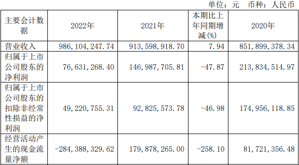 均瑶健康(605388.SH)昨日晚间披露2022年年度报告。报告期内,均瑶健康实现营业收入9.86亿元,同比增长7.94%;实现归属于上市公司股东的净利润7663.13万元,同比下降47.87%;实现归属于上市公司股东的扣除非经常性损益的净利润4922.08万元,同比下降46.98%;经营活动产生的现金流量净额-2.84亿元,同比下降258.10%。