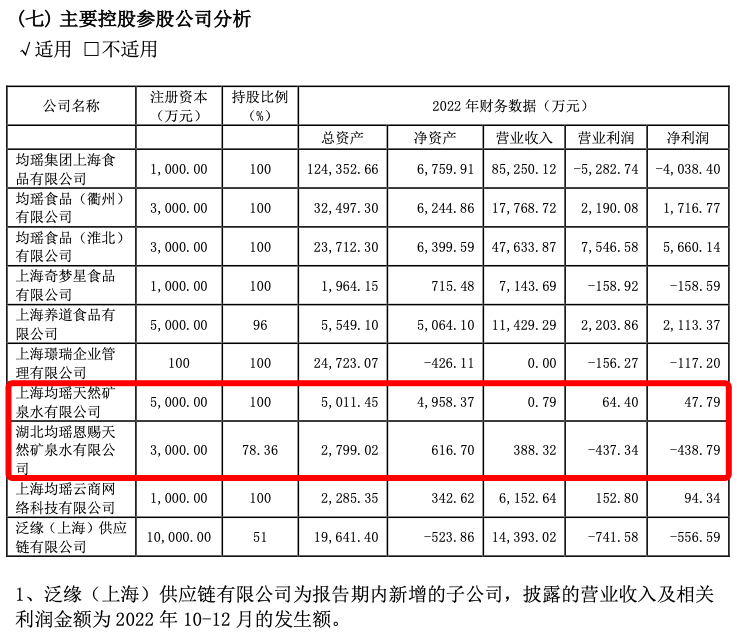 而矿泉水作为均瑶健康此前高调宣布进军的新领域,但时至今日,该板块带给均瑶健康的依旧是亏损。财报显示,2022年,均瑶健康旗下负责矿泉水板块的上海均瑶天然矿泉水有限公司和湖北均瑶恩赐天坛矿泉水有限公司分别实现营收0.79万元和388.32万元,净利润分别为47.79万元和-438.79万元。