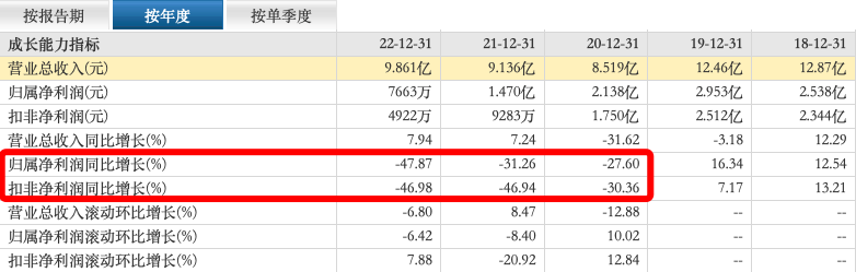 值得一提的是,自2020年8月成功上市以来,均瑶健康就遭遇疫情影响,营业收入从2019年的12.46亿元锐减至2020年的8.52亿元,跌幅超过30%。而时至今日,均瑶健康仍处在缓慢的恢复过程中,并且,均瑶健康在净利润和扣非净利润层面,已经连续三年下滑,且下滑幅度正在不断扩大。2020年至20222年,均瑶健康的净利润分别下滑27.6%、31.26%和47.87%,扣非净利润分别下滑了30.36%、46.94%和46.98%。