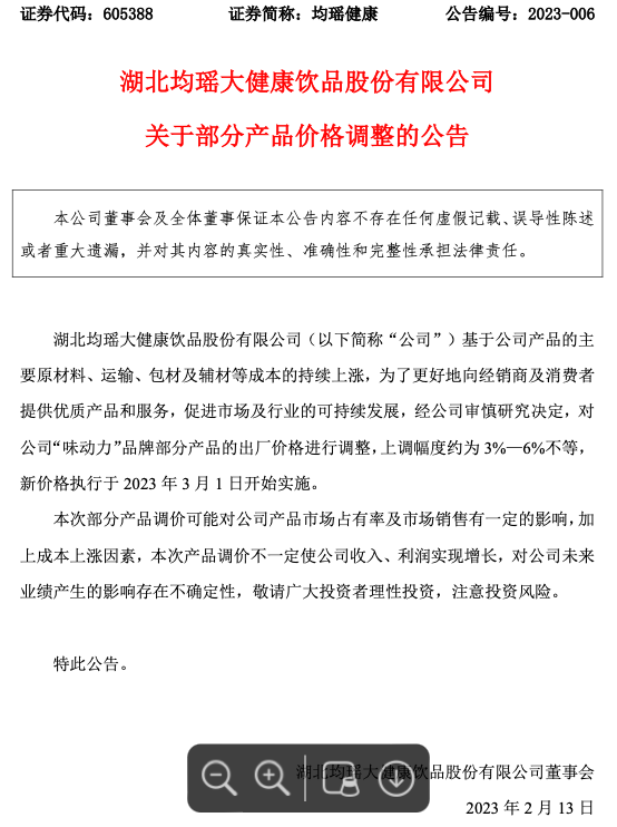 此外,为了抑制成本不断攀升带来的成本压力,均瑶健康已在今年2月宣布对公司“味动力”品牌部分产品的出厂价格进行调整,上调幅度约为3%—6%不等,新价格执行于2023年3月1日开始实施。随着价格的顺利传导,均瑶健康今年下半年在营收、毛利率等方面应该有所改善。