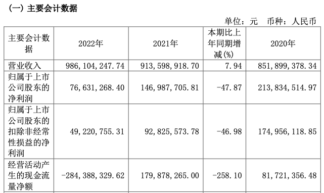 根据湖北均瑶大健康饮品股份有限公司(以下简称“均瑶健康”)4月19日晚间发布的2022年财报显示,公司实现营业总收入9.86亿元,同比增长7.94%;归属于上市公司股东的净利润7663.13万元,同比下降47.87%;归属于上市公司股东的扣除非经常性损益的净利润4922.08万元,同比下降46.98%。