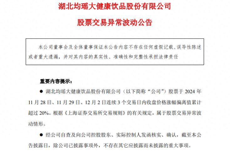 由于11月28日-12月2日的连续三个交易日,公司股票收盘价格涨幅偏离值累计超过20%,12月3日,均瑶健康发布股价异常波动公告,称公司经营正常,不存在应披露而未披露的情况。