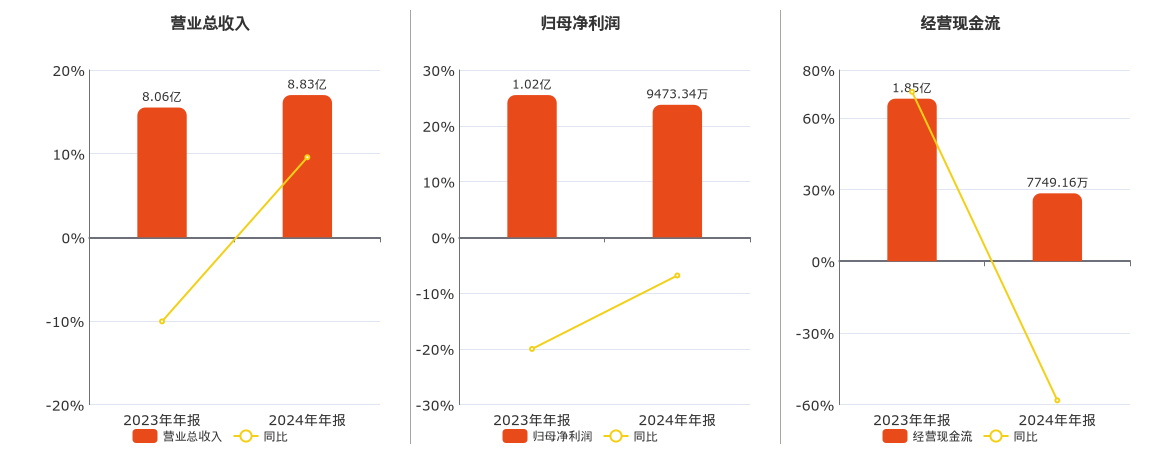 公司营业总收入为8.83亿元,在已披露的同业公司中排名第14。归母净利润为9473.34万元,在已披露的同业公司中排名第14,较去年同报告期归母净利润减少695.84万元,同比较去年同期下降6.84%。经营活动现金净流入为7749.16万元,在已披露的同业公司中排名第15,较去年同报告期经营活动现金净流入减少1.08亿元,同比较去年同期下降58.22%。