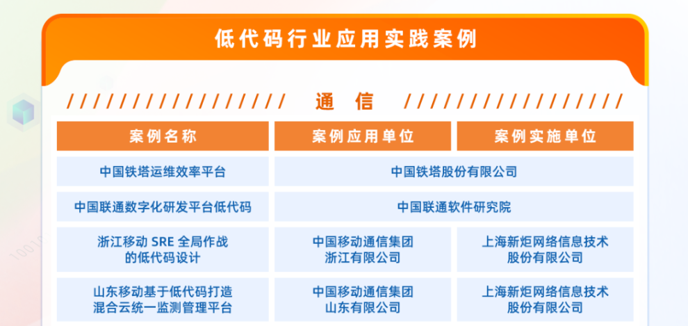 基于多年来对产品定制化的技术打磨以及丰富的企业级服务经验,在本次大会公布的《2023低代码·无代码应用案例汇编》中,新炬网络与中国移动通信集团浙江有限公司、中国移动通信集团山东有限公司两大客户联合打造的“浙江移动SRE全局作战的低代码设计”和“山东移动基于低代码打造混合云统一监测管理平台”,成功入选低代码行业应用实践案例,成为通信行业数字化转型标杆并获得高度认可。