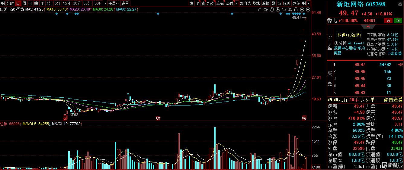 2月12日,此前已经收获9连板的新炬网络开盘后再度涨停,达成10连板。在1月22日-2月12日10个交易日内,区间累计涨幅159.55%。截至发稿时公司股价为49.47元/股,总市值达到了80.50亿元。