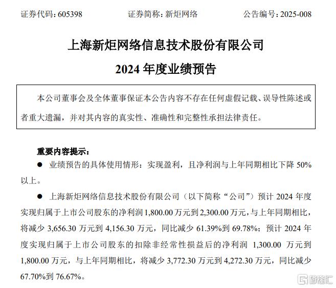 新炬网络发布了2024年业绩预告,预计2024年归母净利润为1800万元-2300万元,同比下降69.78%-61.39%;扣除非经常性损益后的净利润1300万元-1800万元,同比减少67.7%-76.67%。