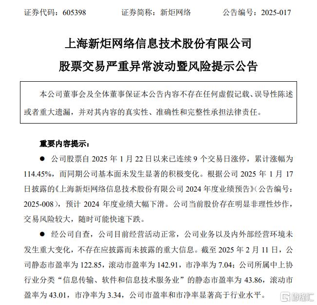 2月11号的公告中指出,公司股票自2025年1月22日以来已连续9个交易日涨停,累计涨幅为114.45%,而同期公司基本面未发生显著的积极变化。根据公司2025年1月17日披露的《上海新炬网络信息技术股份有限公司 2024 年度业绩预告》(公告编号:2025-008),预计2024年度业绩大幅下滑。公司当前股价存在明显非理性炒作,交易风险较大,随时可能快速下跌。