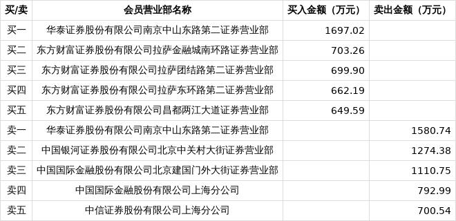 具体来看,第一大买入营业部及卖出营业部均为华泰证券股份有限公司南京中山东路第二证券营业部,买入金额为1697.02万元,卖出金额为1580.74万元。