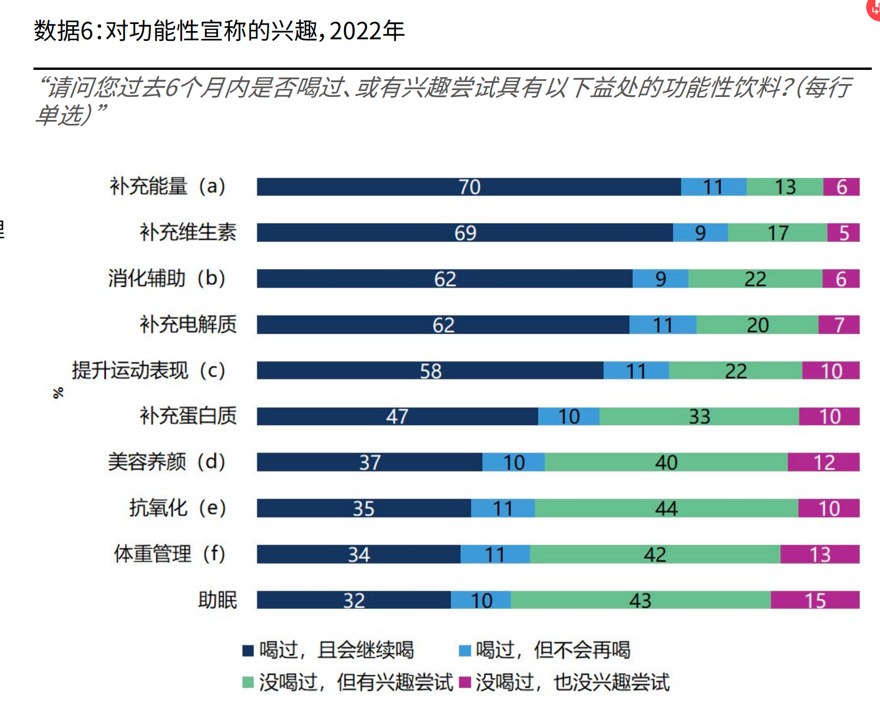 此前,电解质饮料产品主要市场以前较多集中在运动领域。随着饮料消费者近年的健康需求不断增长,特别是随疫情政策调整后的消费集中爆发,电解质饮料越发受到行业关注。