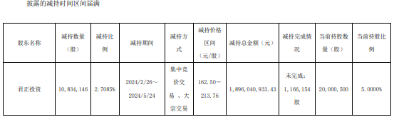根据公告,君正投资减持价格为162.5-213.76元/股,套现总金额为18.96亿元。
