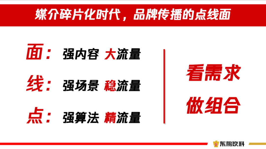 总结一下东鹏的品牌传播推广增长方法:网点覆盖、产品陈列,筛选高势能网点完成高转化解决能见度;用大流量、稳流量、精流量的组合建立并持续提升知名度;打造人群专案,持续渗透重点人群,拉动复购,建立忠诚度。