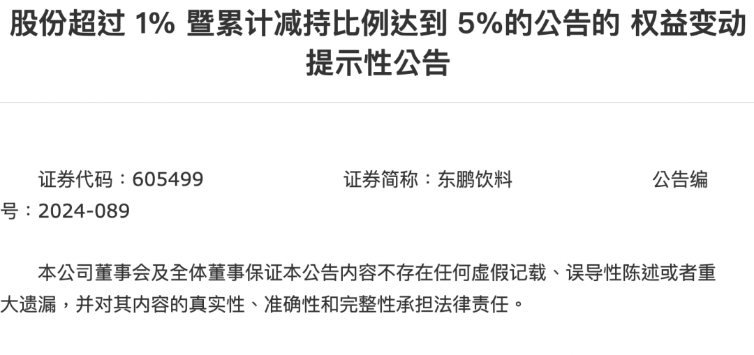 9月25日晚间,东鹏饮料发布公告称,2024年7月25日至2024年9月24期间,君正投资合计减持公司股份436.45万股,占公司总股本的1.0911%。