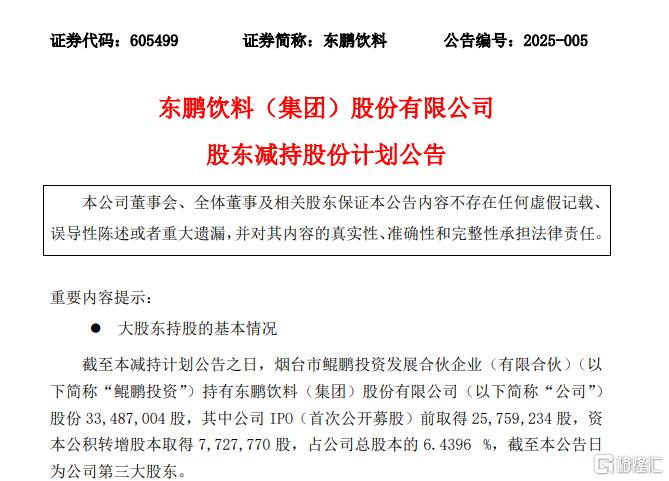 减持计划将在公告之日起十五个交易日后的三个月内推进。截至公告日,鲲鹏投资持有东鹏饮料33,487,004股,其中25,759,234股于IPO前取得,7,727,770股通过资本公积转增股本获得,持股比例为6.4396%,是公司的第三大股东。