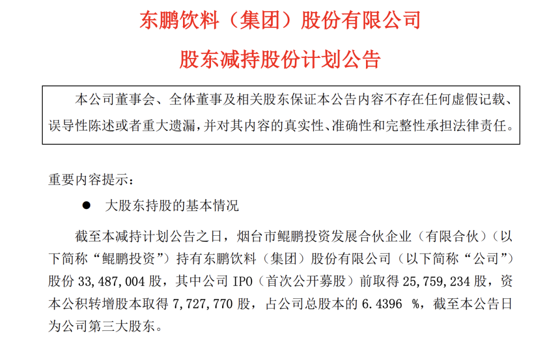 2月20日晚间,东鹏饮料发布公告,第三大股东烟台市鲲鹏投资发展合伙企业(有限合伙)(下称“鲲鹏投资”)因自身资金需求,计划减持公司合计不超过716.89万股股份。