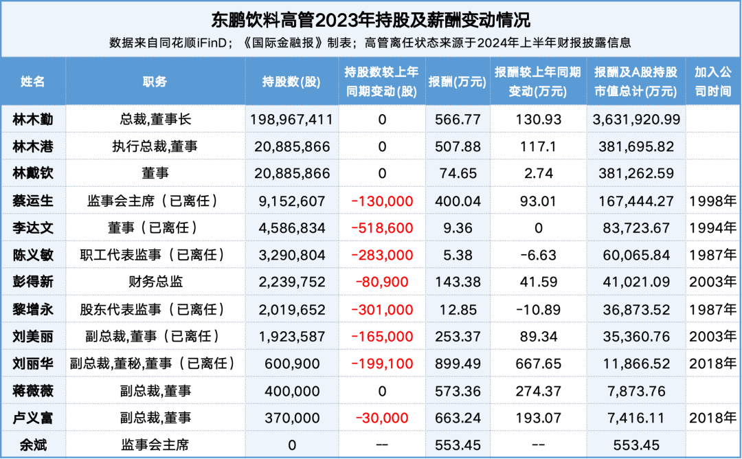 原监事会主席蔡运生,董事李达文,监事陈义敏、黎增永4位均在2000年之前加入东鹏饮料,在职超20年,离职前分别减持了公司13万股、51.86万股、28.3万股、30.1万股股份。