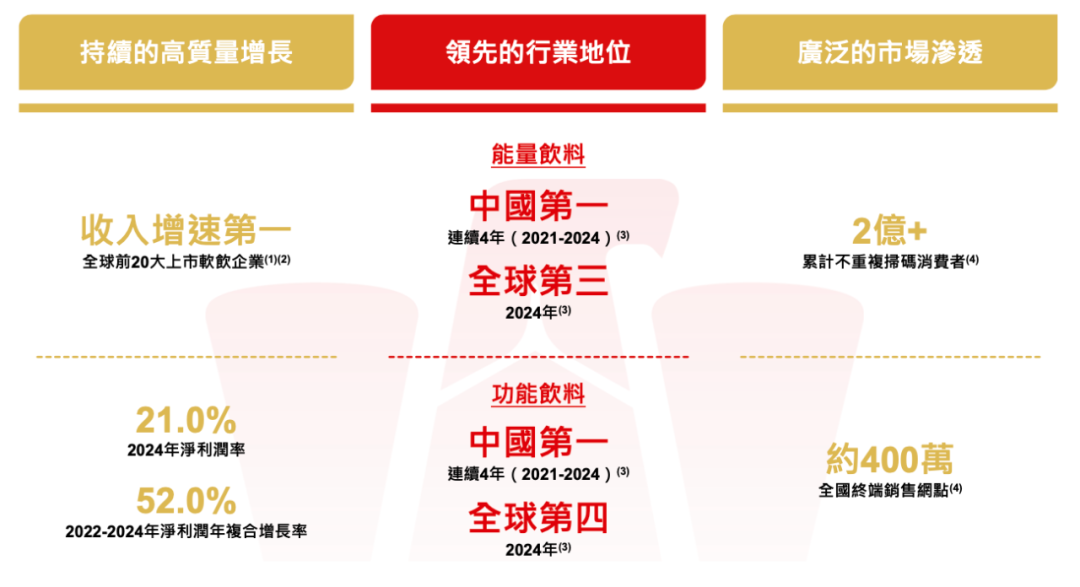 部分业内人士将其归因于功能饮料市场在近年崛起的大趋势。根据研究机构弗若斯特沙利文的数据,2019年至2024年间,中国功能饮料零售额的复合增速高达8.3%,高于整体软饮行业4.7%的水平。东鹏饮料踩准了“提神、补能”这一消费需求的扩大化周期,通过不断强化品牌营销与拓展下沉市场,巩固了其在国内功能饮料领域的领先地位。