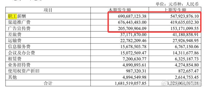 拆解销售费用结构可见,职工薪酬支出6.91亿元,同比增长26.06%,主要源于销售人员规模扩张;渠道推广费高达6.76亿元,同比大涨61.20%;广告宣传费支出2.06亿元,增幅34.30%,则来自市场推广投入的增加。