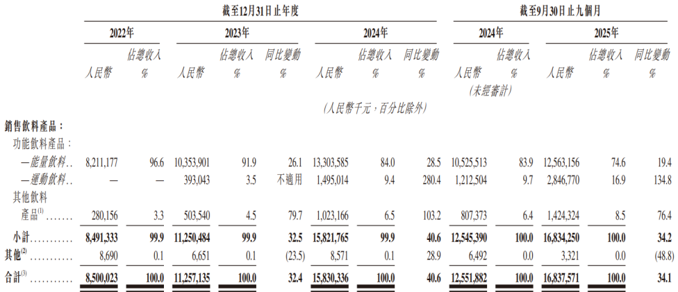 不过,随着东鹏饮料在功能饮料市场的地位持续巩固,其主力产品增速却略有下滑。2023年、2024年及2025年前三季度,公司能量饮料产品收入增速分别为26.1%、28.5%、19.4%。