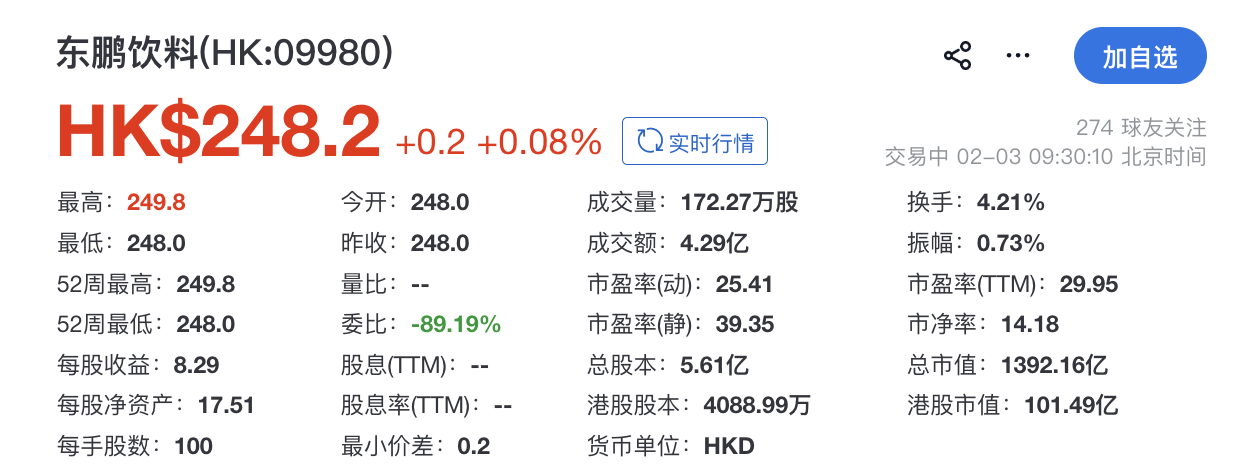 2月3日,东鹏饮料(09980.HK)在港交所挂牌上市,联席保荐人为华泰国际、摩根士丹利、瑞银集团,开盘涨0.08%,总市值1392.16亿港元。