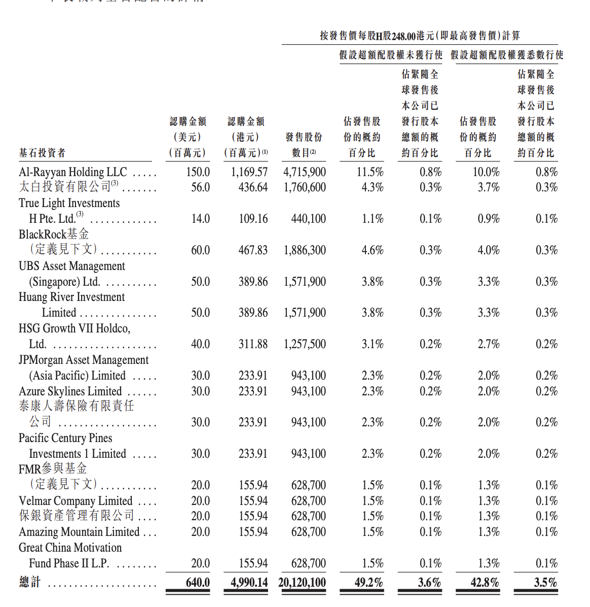 本次IPO全球发售4088.99万股股份(于超额配股权获行使前),香港公开发售占10%,国际发售占90%。最终发售价每股248港元,全球发售净筹约99.943亿港元。