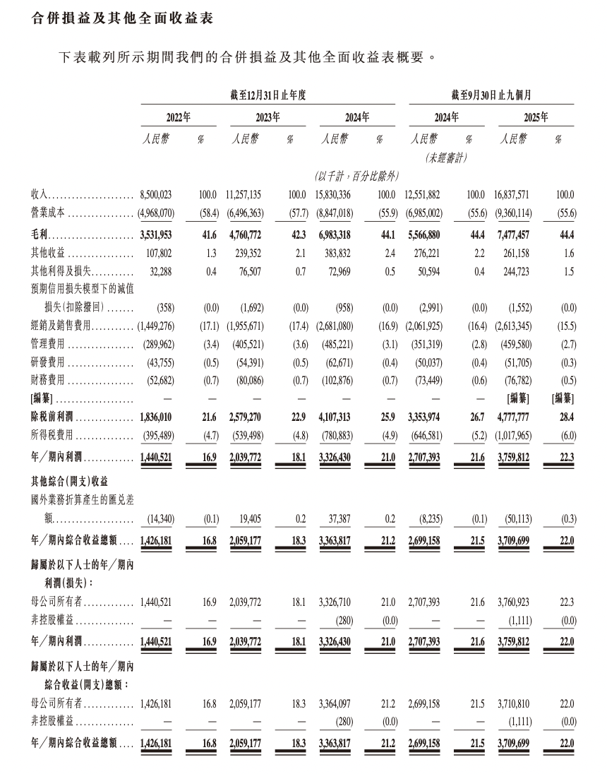 据招股书,2022年-2024年,东鹏饮料实现收入分别为85亿元、112.57亿元、158.3亿元;年内利润分别为14.41亿元、20.4亿元、33.26亿元。