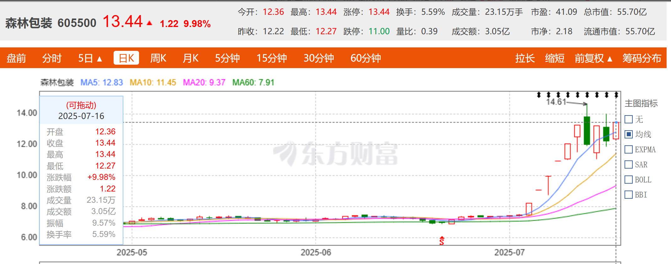 近日,森林包装的股价大幅波动备受关注。从7月3日至7月10日,森林包装股价曾连续6个交易日录得涨停板。此后公司股价横盘调整,7月16日,森林包装再次涨停,股价报收13.44元。