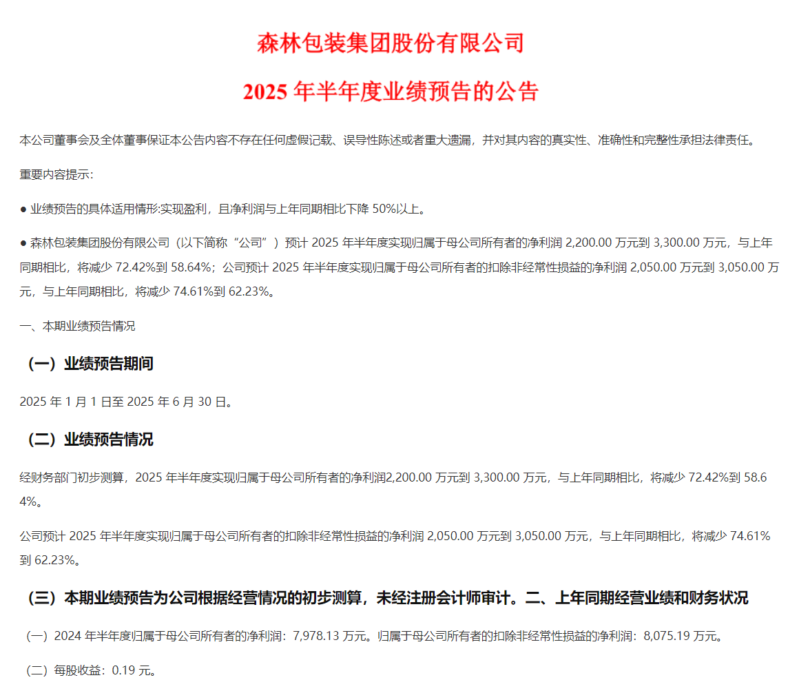 根据业绩预告,森林包装预计2025年半年度实现净利润2200万元到3300万元,与上年同期相比,将减少72.42%到58.64%,预计实现扣非净利润2050万元到3050万元,与上年同期相比,将减少74.61%到62.23%。