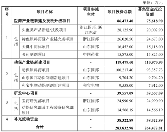 国邦医药7月21日披露的招股说明书显示,公司拟募集资金26.45亿元,计划分别用于医药产业链新建及技改升级项目、动保产业链新建项目、研发中心项目、补充流动资金。