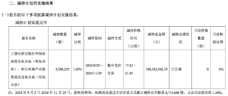 而在较早的2024年9月2日-2024年11月29日,浙民投恒华、丝路基金通过大宗交易方式累计减持公司股票8,715,648股,占公司总股本的1.56%。