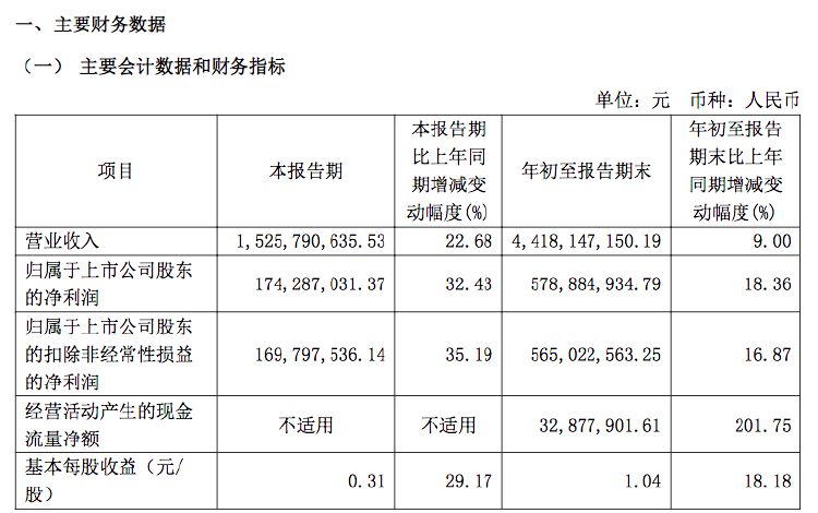 2024年10月19日,国邦医药披露第三季度报告,公司2024年前三季度实现营业收入44.18亿元,同比增长9.0%;实现归属于上市公司股东的净利润5.79亿元,同比增长18.36%;实现扣非后归母净利润5.65亿元,同比增长16.87%;实现基本每股收益1.04元,同比增长18.18%。
