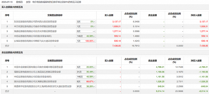 具体来看,东吴证券苏州西北街证券营业部、申万宏源证券有限公司南京华侨路证券营业部分别买入3137.17万元、1928.21万元;中国中金财富证券有限公司南京龙蟠中路证券营业部、瑞银证券上海花园石桥路证券营业部分别卖出4788.21万元、1190.06万元。