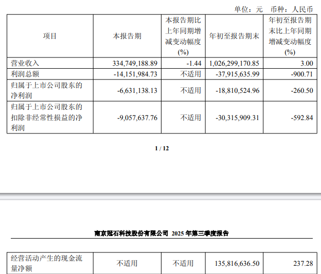 冠石科技 (605588.SH)近日发布2025年第三季度报告显示,2025年第三季度,公司实现营业收入3.35亿元,同比下滑1.44%;归属于上市公司股东的净利润-663.11万元;归属于上市公司股东的扣除非经常性损益的净利润-905.76万元。