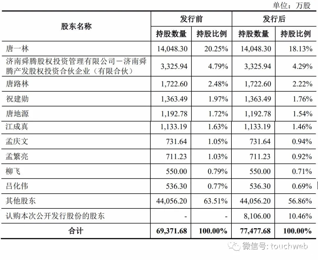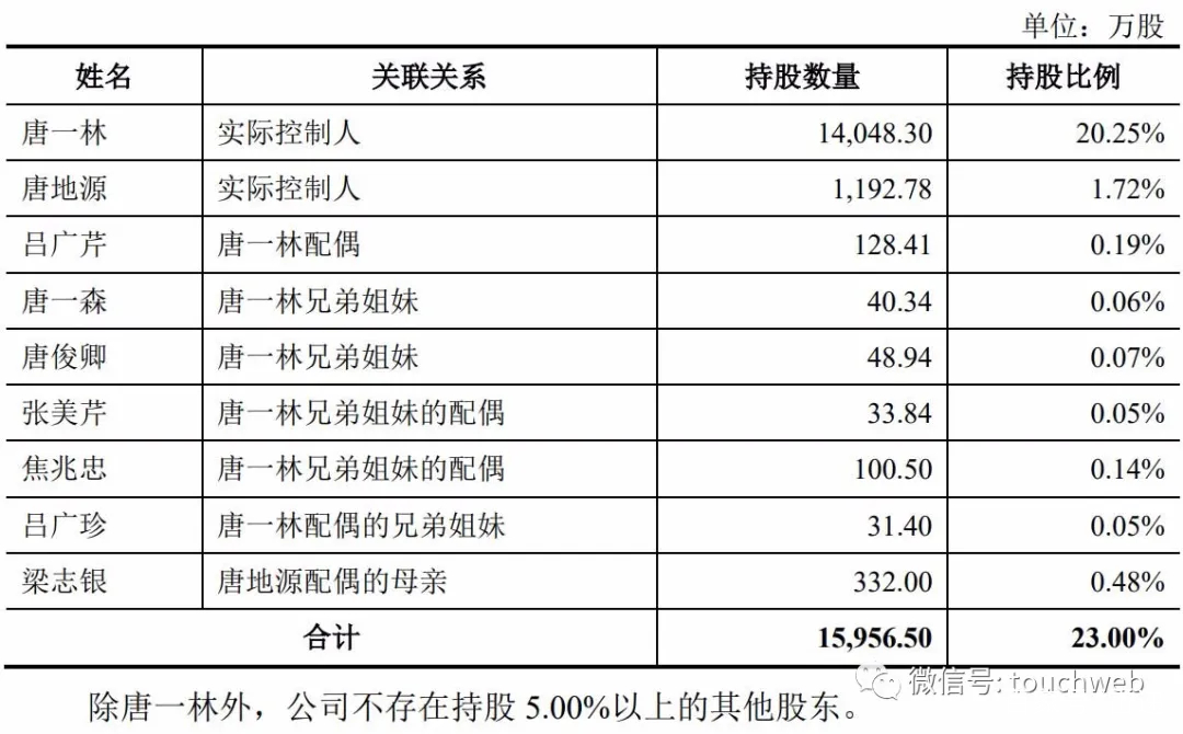 IPO后,唐一林直接持股为18.13%,唐路林持股为2.22%。