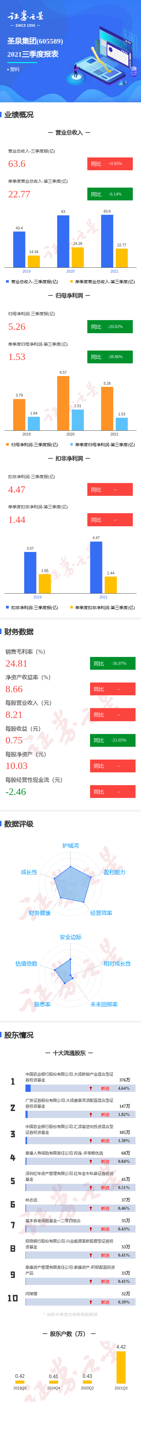 圣泉集团2021三季报显示,公司主营收入63.61亿元,同比上升0.95%;归母净利润5.26亿元,同比下降20.02%;扣非净利润4.47亿元,其中2021年第三季度,公司单季度主营收入22.78亿元,同比下降6.14%;单季度归母净利润1.54亿元,同比下降38.86%;单季度扣非净利润1.45亿元,负债率39.49%,投资收益1963.78万元,财务费用1.09亿元,毛利率24.81%。