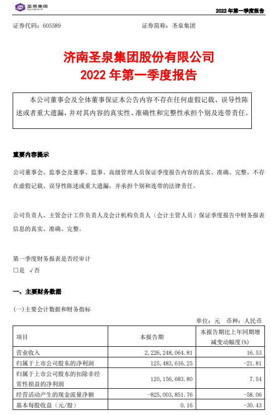 据圣泉集团2022年一季度财报显示,公司实现营业收入为22.26亿元,同比增长16.53%;净利润1.25亿元,同比下滑21.81%。