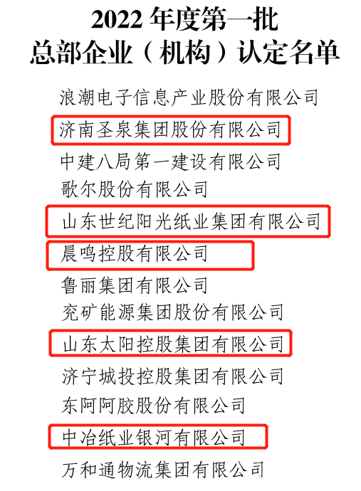 2023年1月10日,山东省发展和改革委员会发布《关于公布2022年度第一批总部企业(机构)认定名单的通知》,经企业自主申报,各县(市、区)和市级相关部门层层把关,专家评审、会议研究和社会公示等程序,181家企业被认定为2022年度第一批省级总部企业(机构)。经汇总,山东太阳控股集团有限公司、晨鸣控股有限公司、山东世纪阳光纸业集团有限公司、中冶纸业银河有限公司和济南圣泉集团股份有限公司5家山东省造纸行业协会会员单位入选认定名单,协会代表全体会员向几家企业表示热烈祝贺!