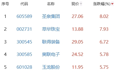 其中,圣泉集团、萃华珠宝、联得装备、奥联电子、玉龙股份位列板块涨幅前五位,涨幅分别为8.02%、7.93%、6.72%、5.78%、5.75%。
