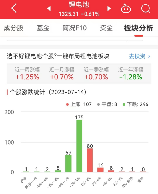 今日,锂电池板块整体涨幅-0.61%,其中107只股票上涨,8只股票平盘,246只股票下跌。